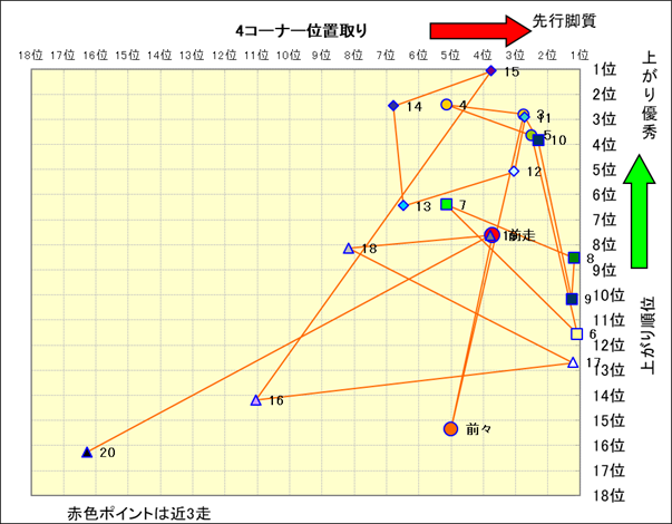 脚質解析 近20レースの4コーナーでの位置取りと上がり順位(頭数補正後) |