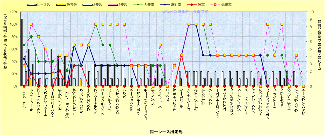 ライバル(相性)解析 同一レースに下記馬が出走した場合の成績とその馬に先着する先着率 |