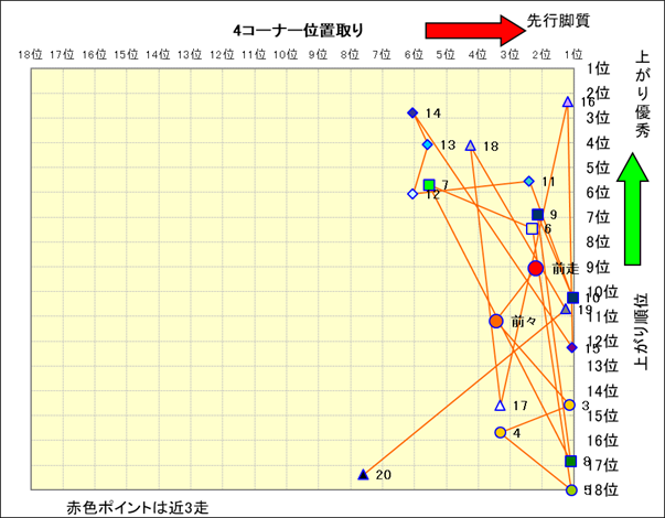 脚質解析 近20レースの4コーナーでの位置取りと上がり順位(頭数補正後) |