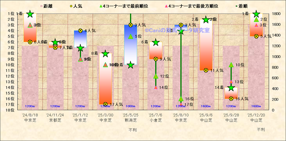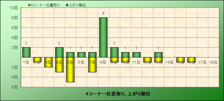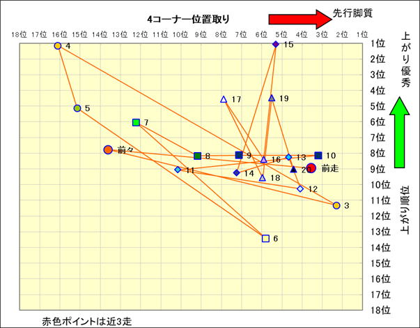 脚質解析 近20レースの4コーナーでの位置取りと上がり順位(頭数補正後) |