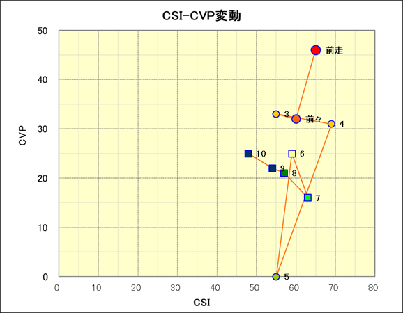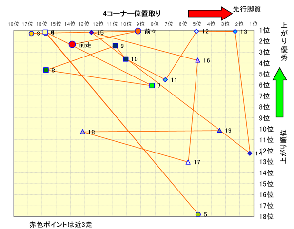 近走における4コーナーでの位置取りと上がり順位(頭数補正後) |