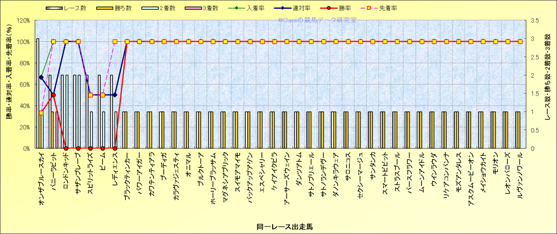 ライバル(相性)解析 同一レースに下記馬が出走した場合の成績とその馬に先着する先着率 |
