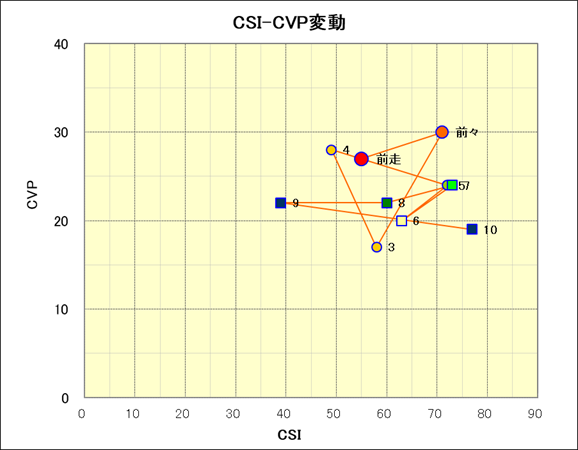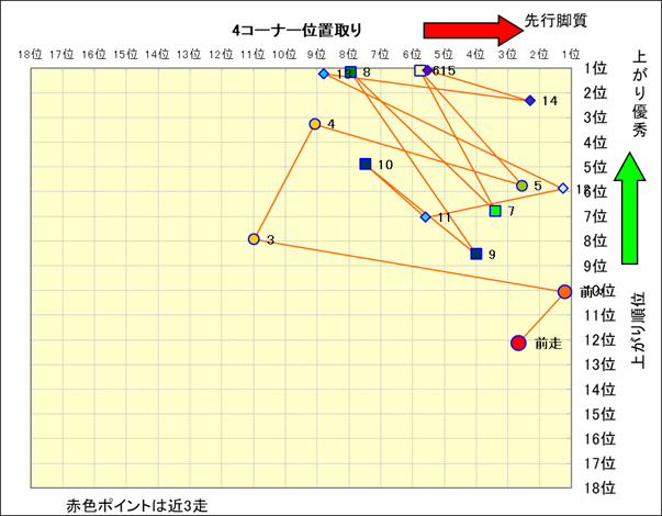 近走における4コーナーでの位置取りと上がり順位(頭数補正後) |