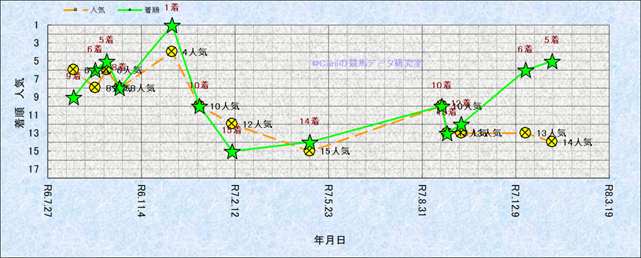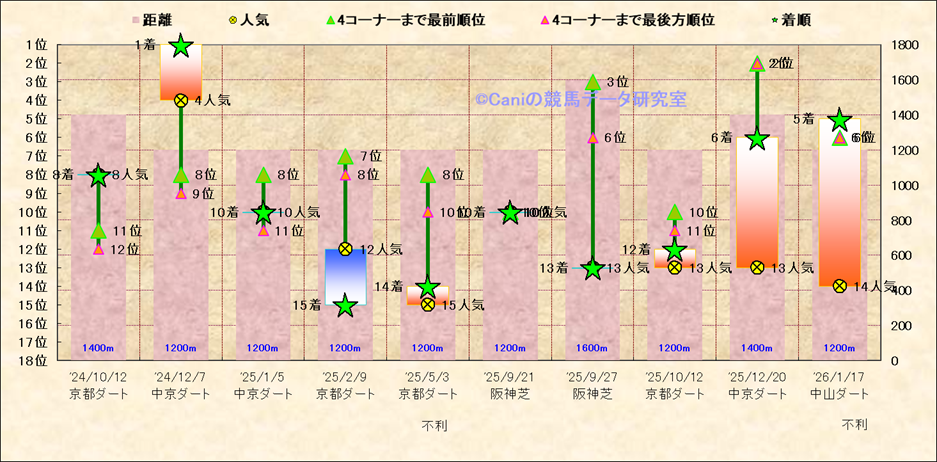 脚質解析 近20レースの4コーナーでの位置取りと上がり順位(頭数補正後) |