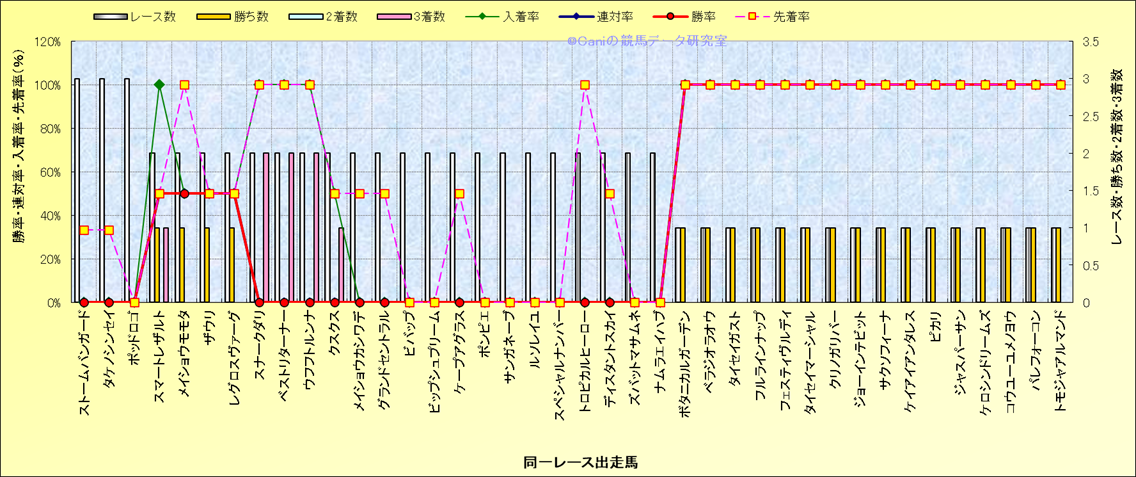 ライバル(相性)解析 同一レースに下記馬が出走した場合の成績とその馬に先着する先着率 |