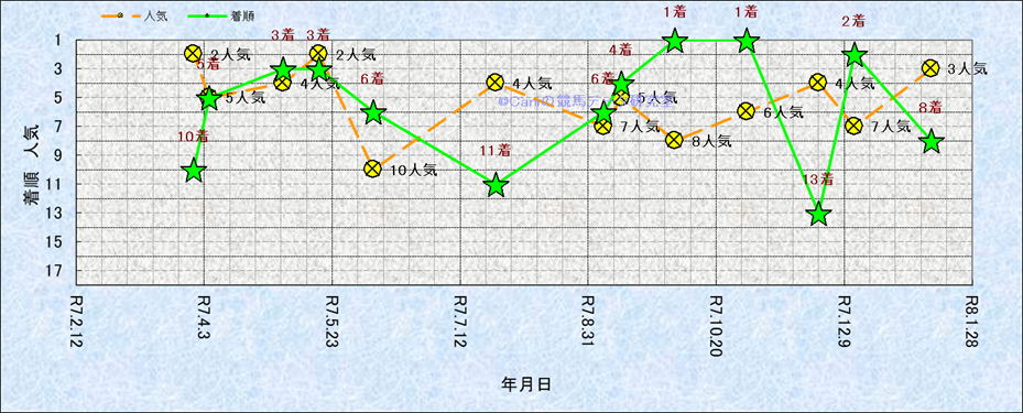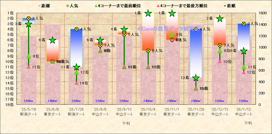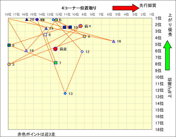 脚質解析 近20レースの4コーナーでの位置取りと上がり順位(頭数補正後) |