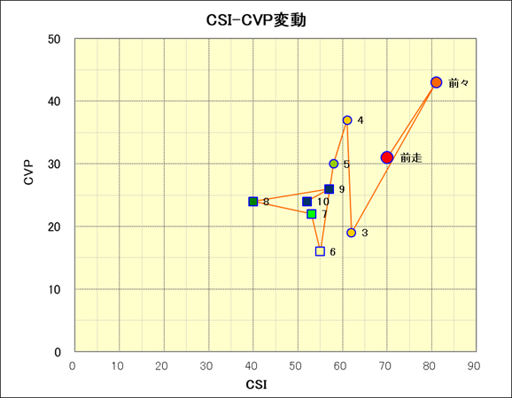 近走における4コーナーでの位置取りと上がり順位(頭数補正後) |