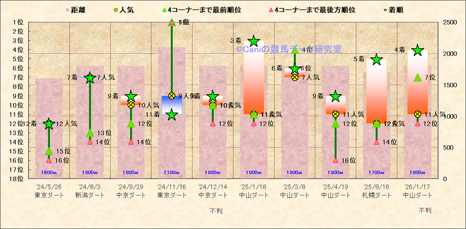 脚質解析 近20レースの4コーナーでの位置取りと上がり順位(頭数補正後) |