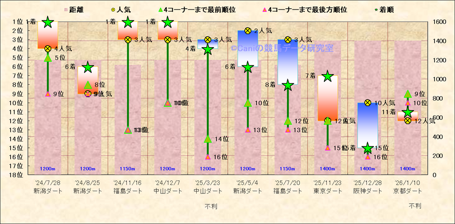 脚質解析 近20レースの4コーナーでの位置取りと上がり順位(頭数補正後) |