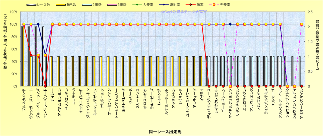 ライバル(相性)解析 同一レースに下記馬が出走した場合の成績とその馬に先着する先着率 |