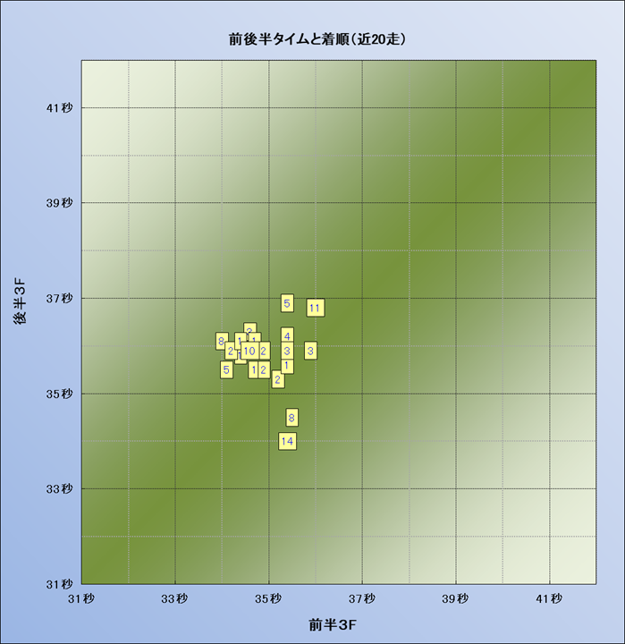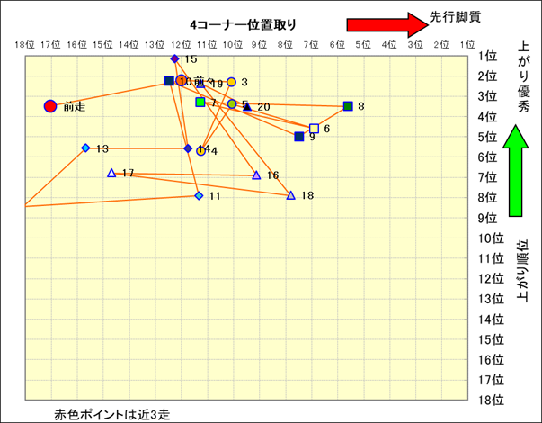 脚質解析 近20レースの4コーナーでの位置取りと上がり順位(頭数補正後) |