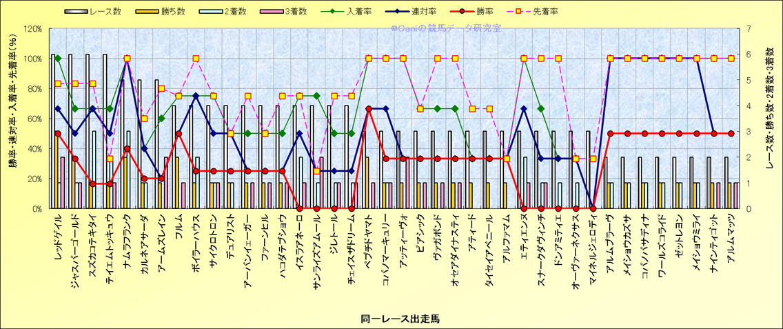 ライバル(相性)解析 同一レースに下記馬が出走した場合の成績とその馬に先着する先着率 |