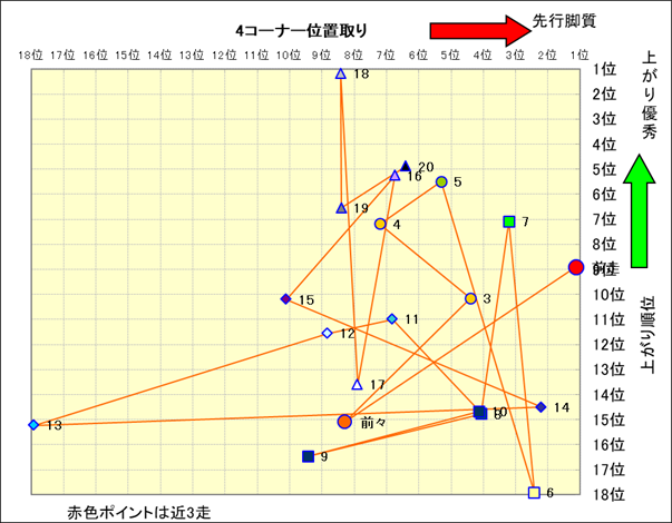 近走における4コーナーでの位置取りと上がり順位(頭数補正後) |