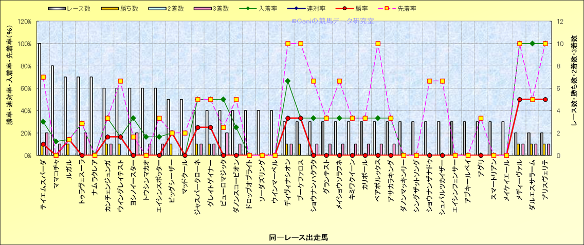 ライバル(相性)解析 同一レースに下記馬が出走した場合の成績とその馬に先着する先着率 |