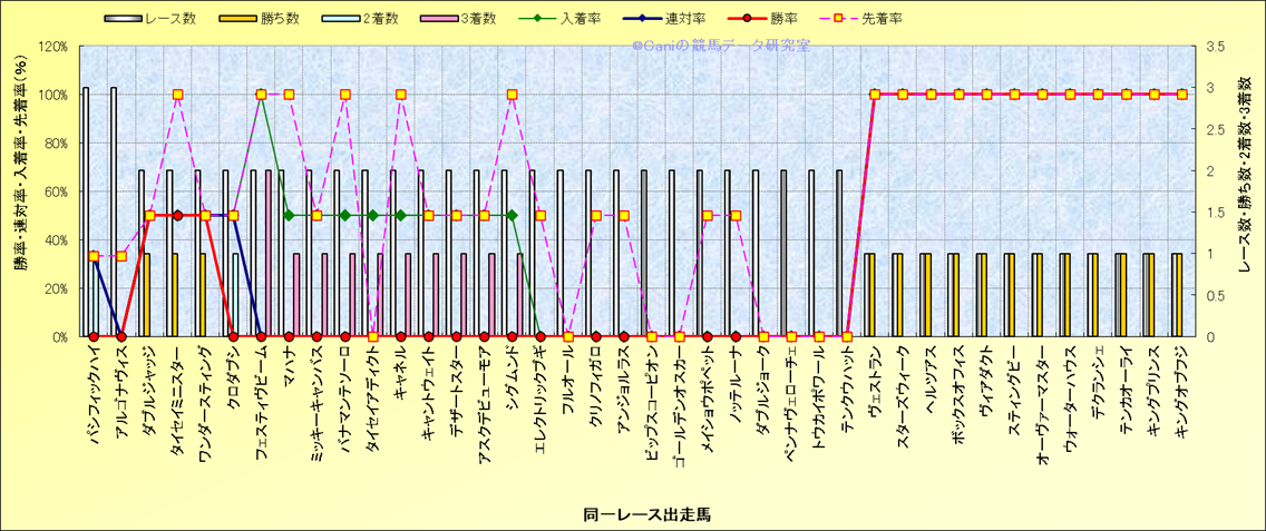 ライバル(相性)解析 同一レースに下記馬が出走した場合の成績とその馬に先着する先着率 |