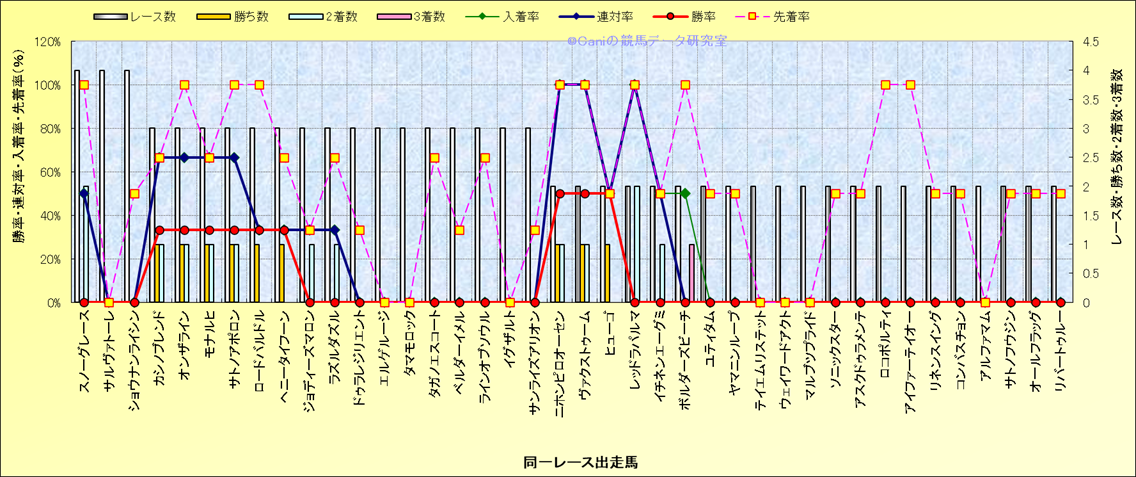 ライバル(相性)解析 同一レースに下記馬が出走した場合の成績とその馬に先着する先着率 |