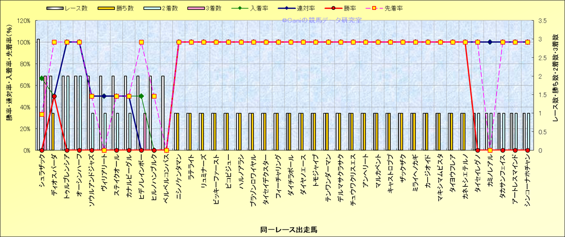 ライバル(相性)解析 同一レースに下記馬が出走した場合の成績とその馬に先着する先着率 |