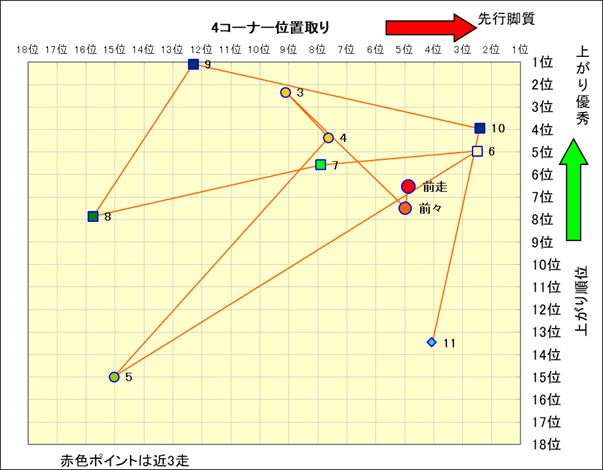 近走における4コーナーでの位置取りと上がり順位(頭数補正後) |