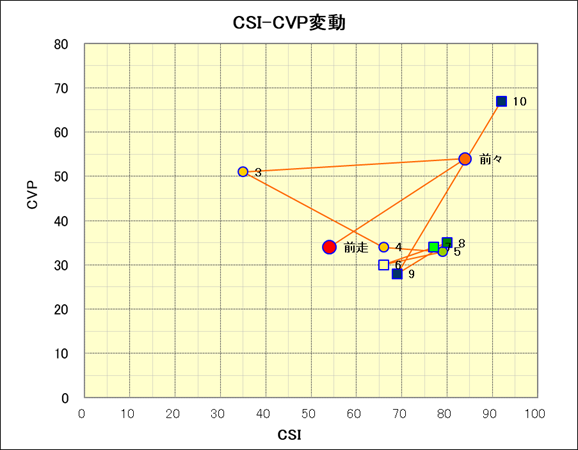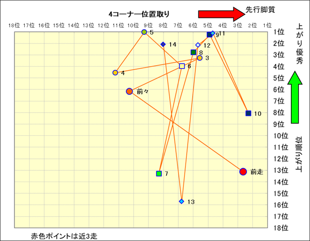 近走における4コーナーでの位置取りと上がり順位(頭数補正後) |