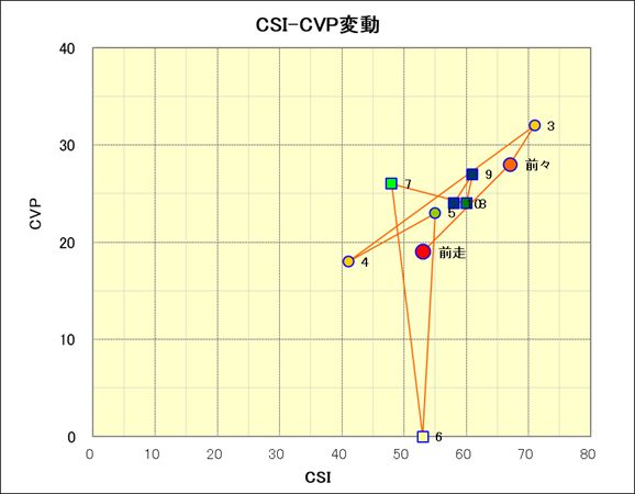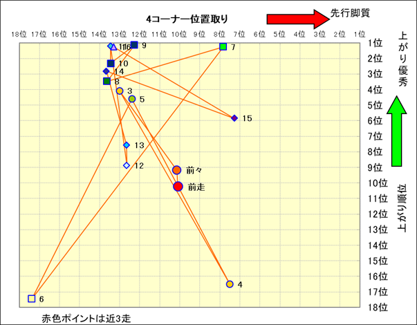 近走における4コーナーでの位置取りと上がり順位(頭数補正後) |