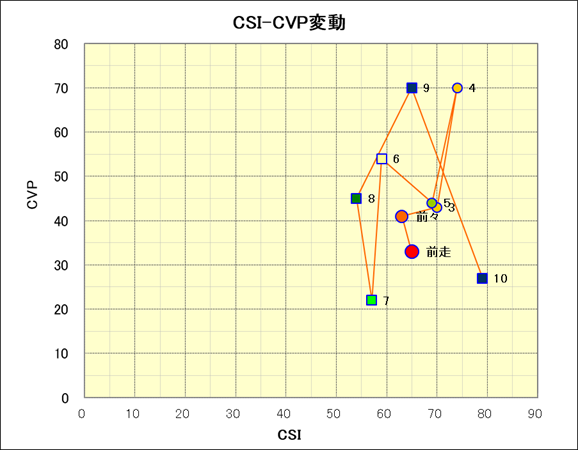 近走における4コーナーでの位置取りと上がり順位(頭数補正後) |