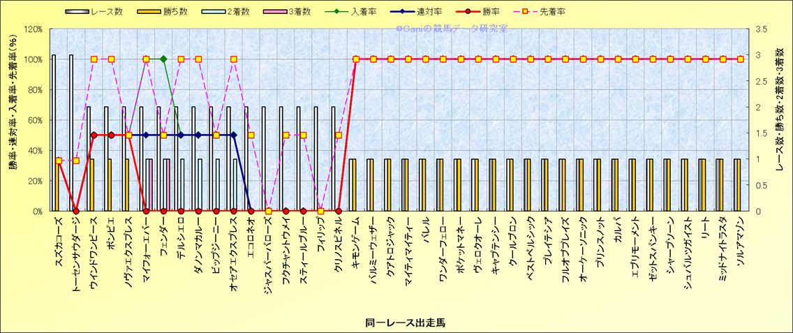 ライバル(相性)解析 同一レースに下記馬が出走した場合の成績とその馬に先着する先着率 |