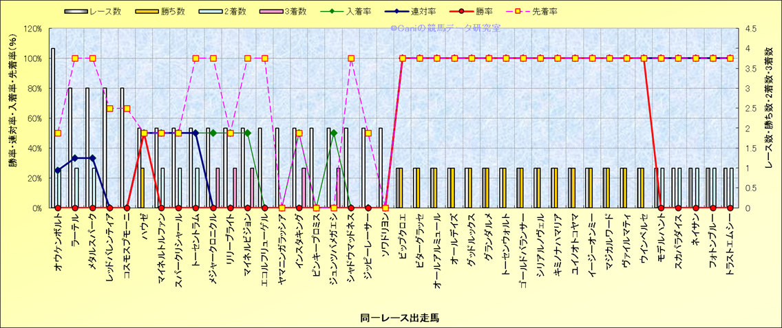 ライバル(相性)解析 同一レースに下記馬が出走した場合の成績とその馬に先着する先着率 |