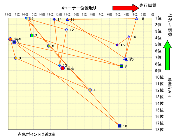 近走における4コーナーでの位置取りと上がり順位(頭数補正後) |