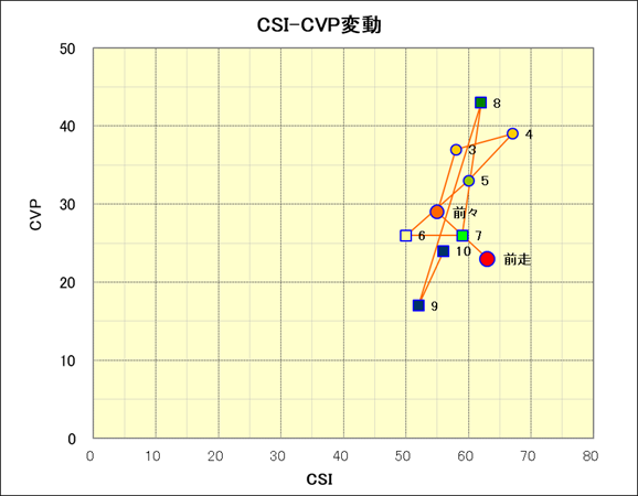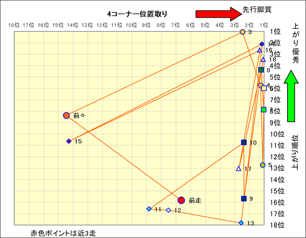 近走における4コーナーでの位置取りと上がり順位(頭数補正後) |