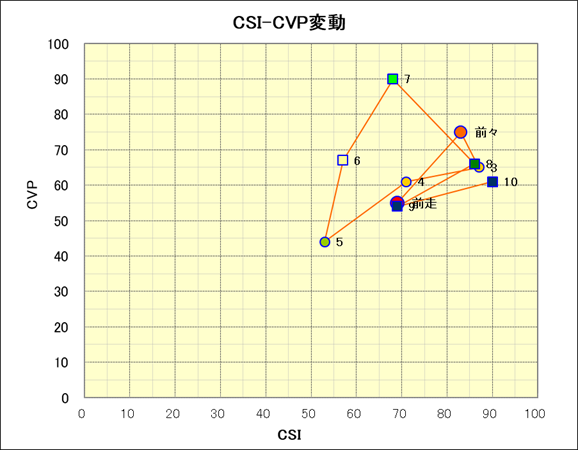 近走における4コーナーでの位置取りと上がり順位(頭数補正後) |