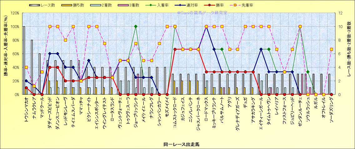 ライバル(相性)解析 同一レースに下記馬が出走した場合の成績とその馬に先着する先着率 |