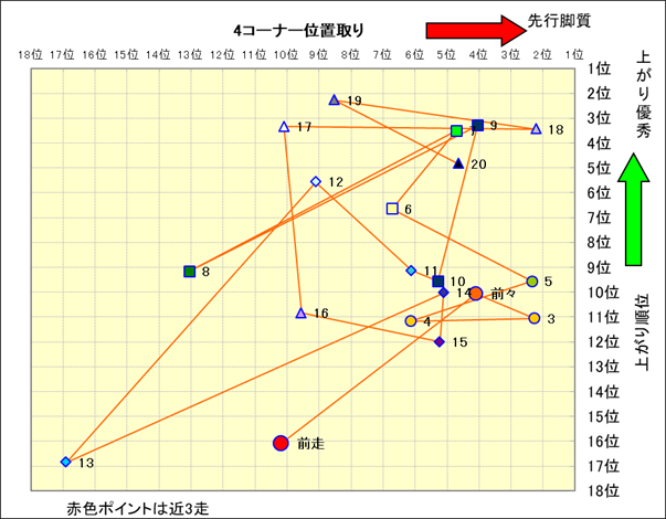 脚質解析 近20レースの4コーナーでの位置取りと上がり順位(頭数補正後) |