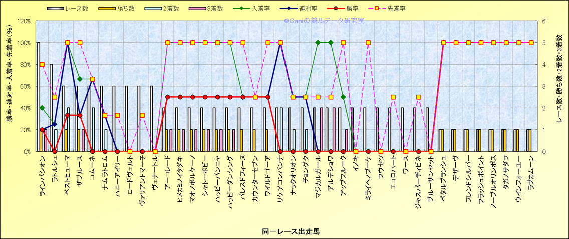 ライバル(相性)解析 同一レースに下記馬が出走した場合の成績とその馬に先着する先着率 |