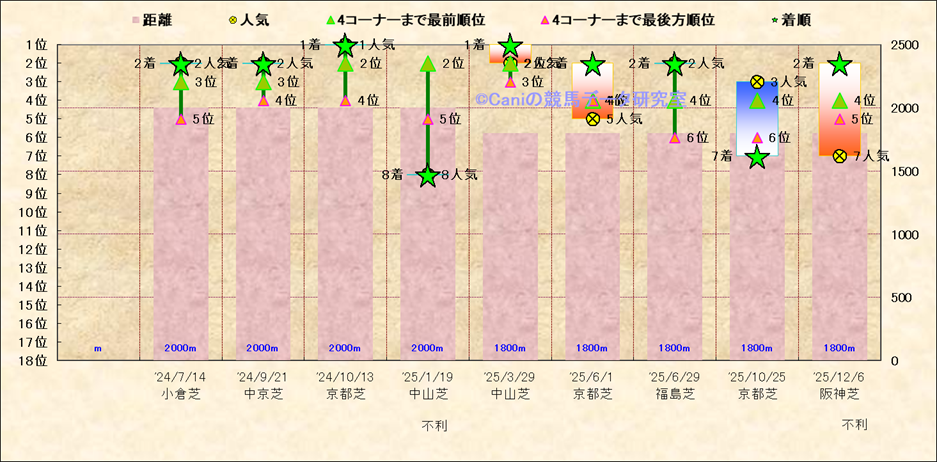 脚質解析 近20レースの4コーナーでの位置取りと上がり順位(頭数補正後) |