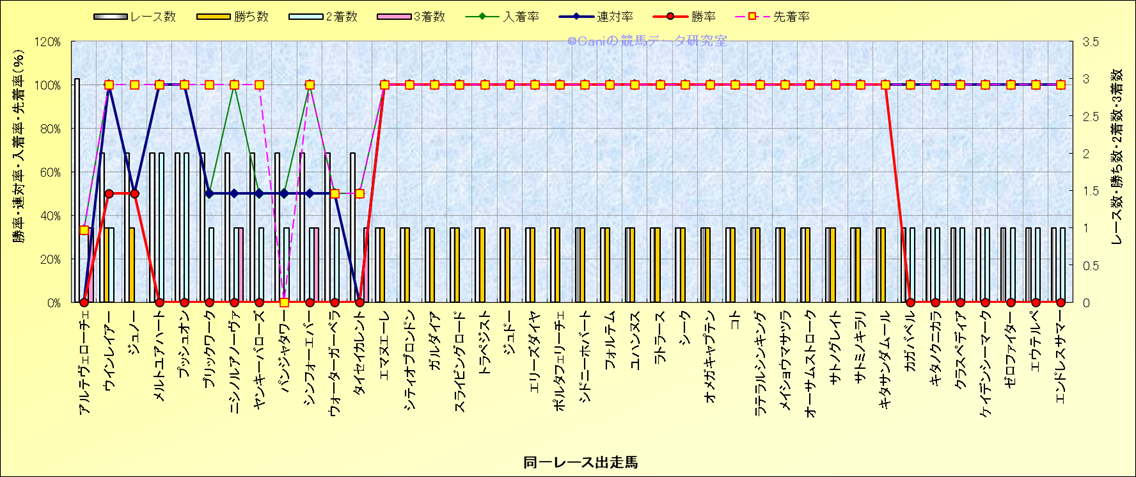 ライバル(相性)解析 同一レースに下記馬が出走した場合の成績とその馬に先着する先着率 |
