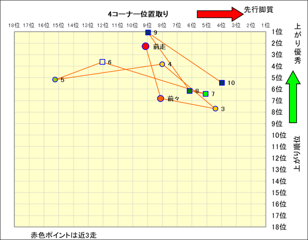 近走における4コーナーでの位置取りと上がり順位(頭数補正後) |