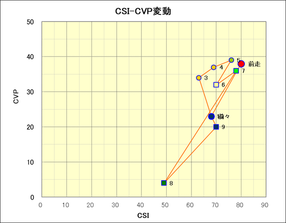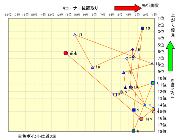 近走における4コーナーでの位置取りと上がり順位(頭数補正後) |