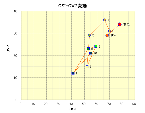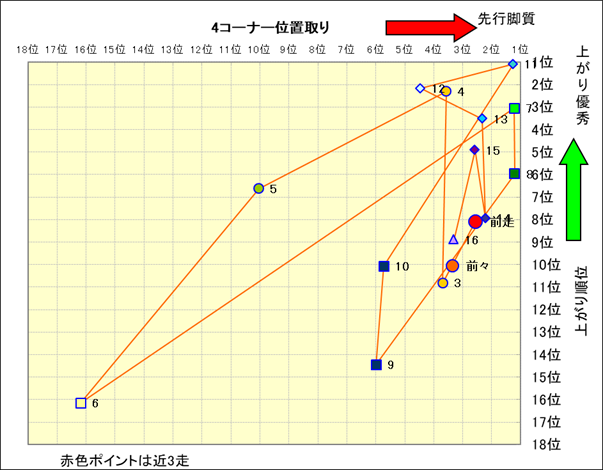 近走における4コーナーでの位置取りと上がり順位(頭数補正後) |