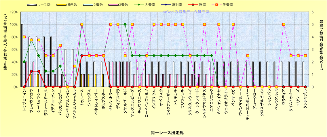 ライバル(相性)解析 同一レースに下記馬が出走した場合の成績とその馬に先着する先着率 |