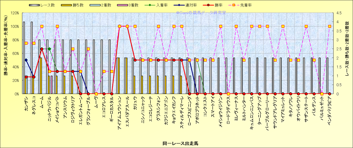 ライバル(相性)解析 同一レースに下記馬が出走した場合の成績とその馬に先着する先着率 |
