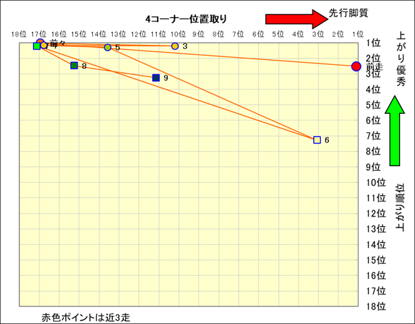 近走における4コーナーでの位置取りと上がり順位(頭数補正後) |