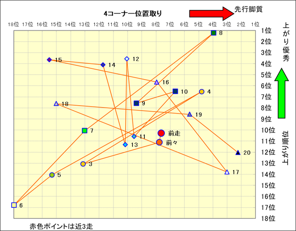 近走における4コーナーでの位置取りと上がり順位(頭数補正後) |