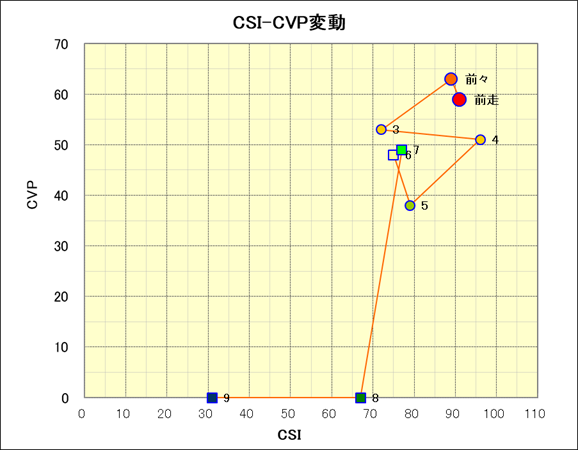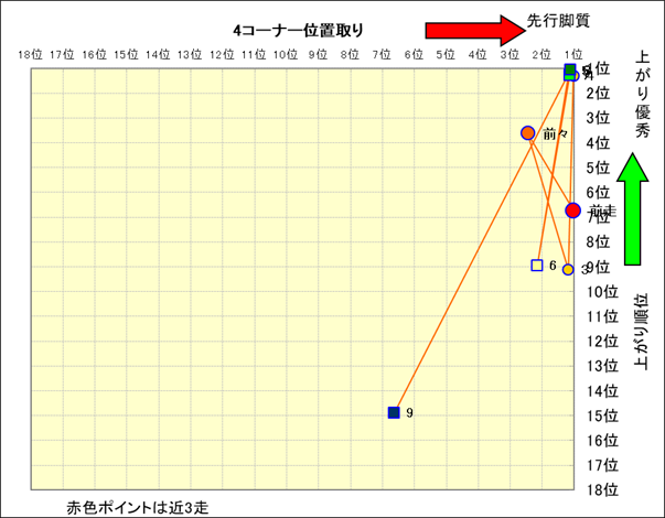 近走における4コーナーでの位置取りと上がり順位(頭数補正後) |