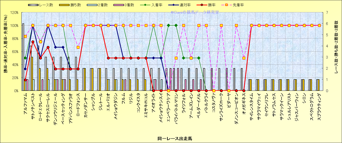 ライバル(相性)解析 同一レースに下記馬が出走した場合の成績とその馬に先着する先着率 |