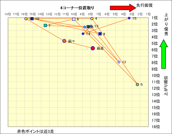 近走における4コーナーでの位置取りと上がり順位(頭数補正後) |
