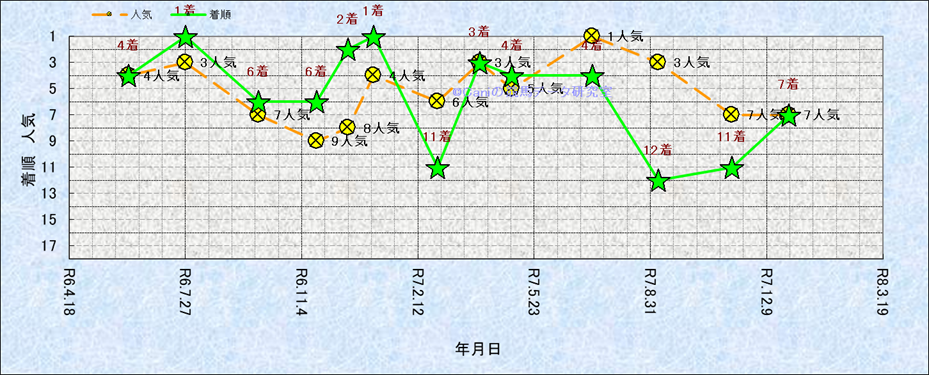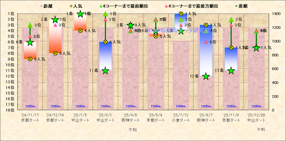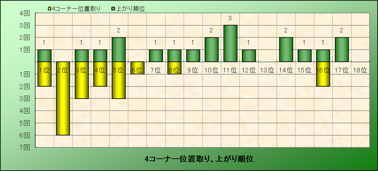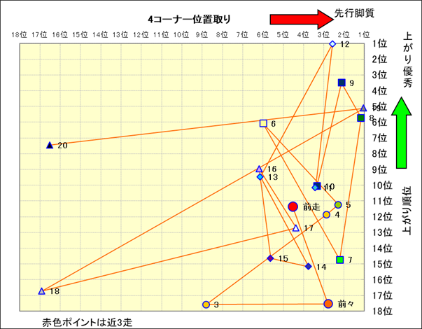 脚質解析 近20レースの4コーナーでの位置取りと上がり順位(頭数補正後) |