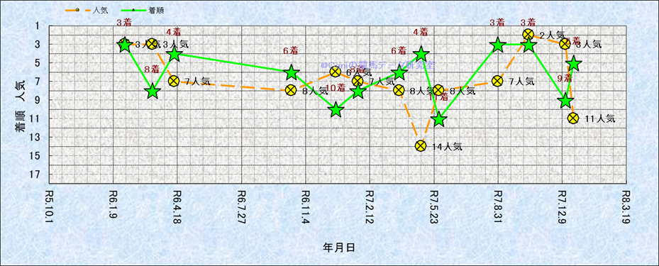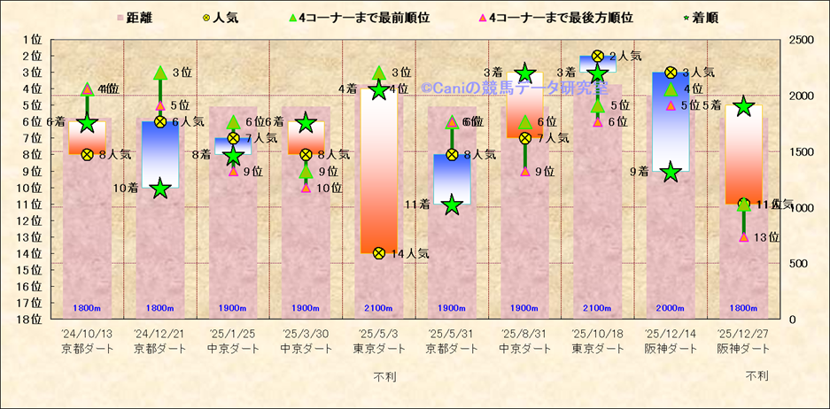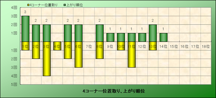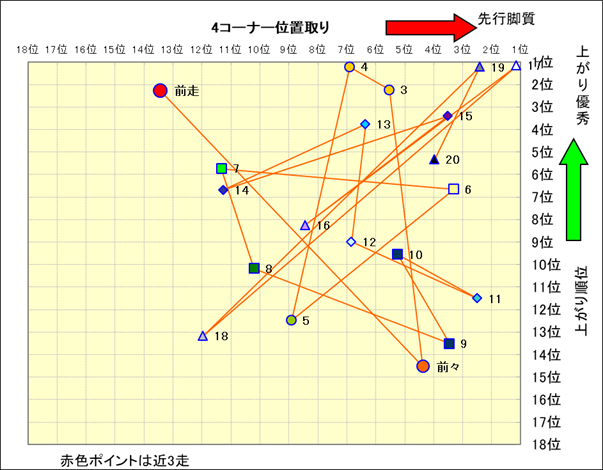脚質解析 近20レースの4コーナーでの位置取りと上がり順位(頭数補正後) |