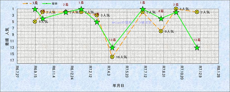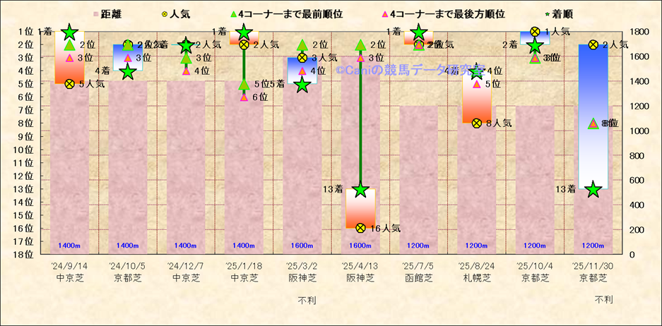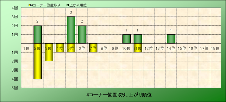 脚質解析 近20レースの4コーナーでの位置取りと上がり順位(頭数補正後) |
