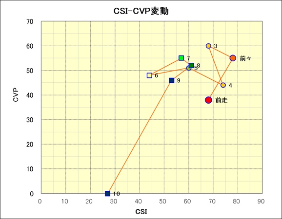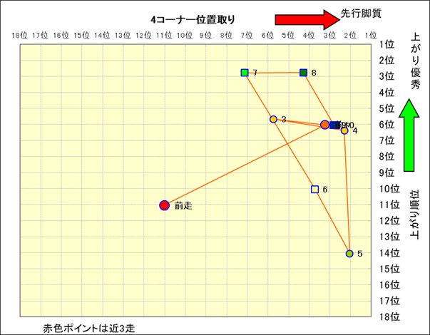 近走における4コーナーでの位置取りと上がり順位(頭数補正後) |