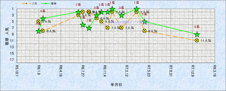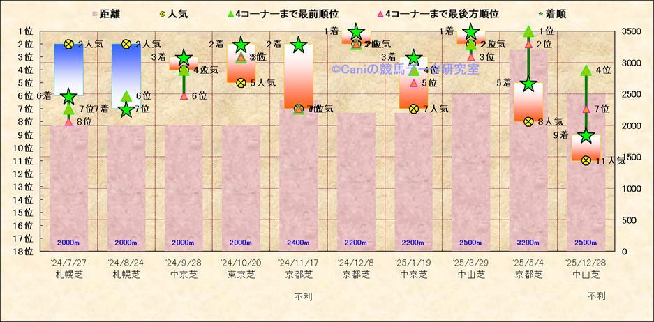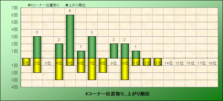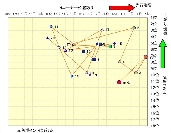 脚質解析 近20レースの4コーナーでの位置取りと上がり順位(頭数補正後) |